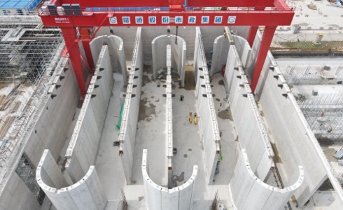 2020.12-2022.12,上海水务建设领域首次大规模应用预制拼装工艺,工程包括新建50万m³AAO生物反应池、平流式沉淀池等多个建筑物。AAO生物反应池部分结构为预制混凝土构件,单个构件最重为31.13t。工程采用五轴搅拌桩、PC工法组合钢管桩、UHPC超高性能混凝土等多种新兴工艺。